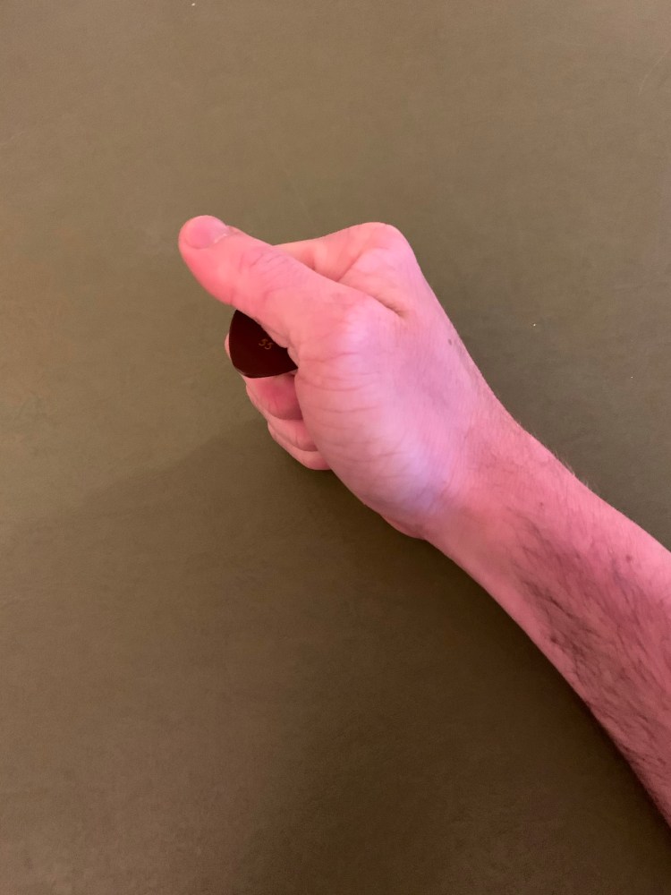 After you’ve done that for a while, with your loose, swinging hand practice tightening and relaxing your fist around the pick. Tighten your whole fist and alternate with a relaxed grip. Remember to keep your wrist loose the whole time.